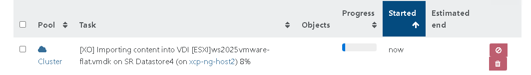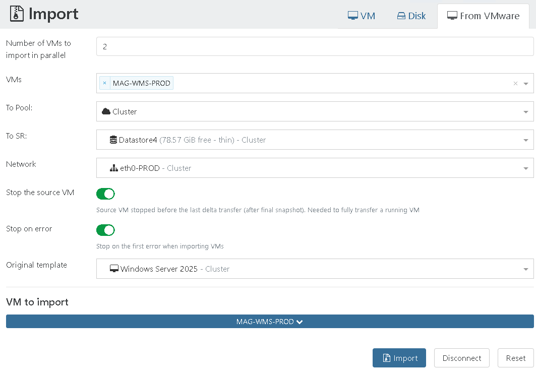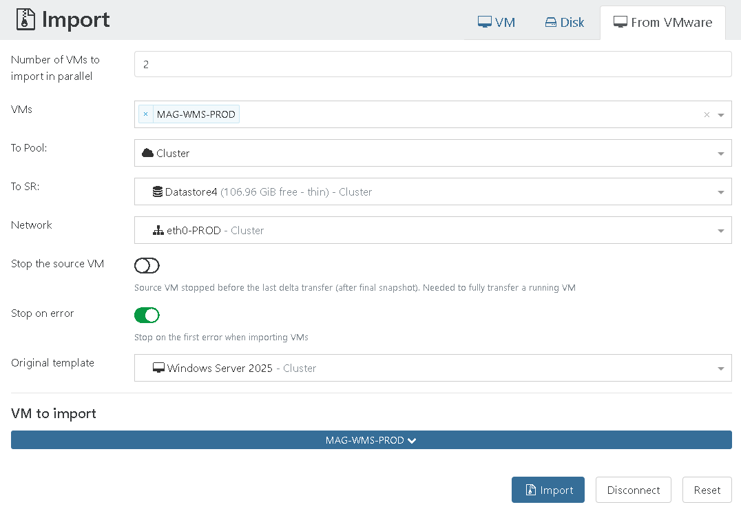 W Xen Orchestra powtórz te same kroki co w Fazie 1, Krok 2, z jedną zmianą: tym razem zaznacz parametr „Stop the source VM” i kliknij Import.