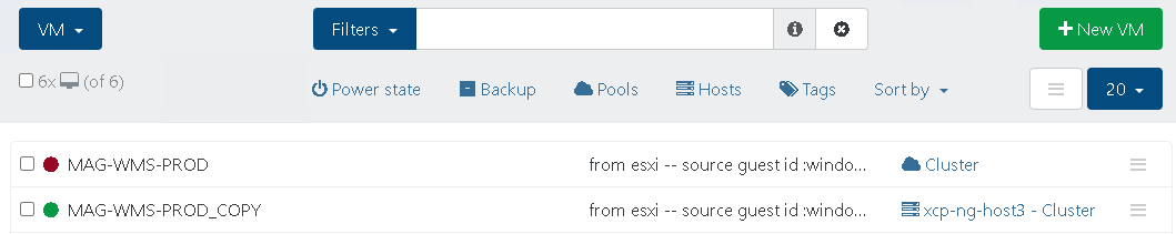 Kiedy transfer się skończy, na liście VM w panelu XO zobaczysz wyłączoną maszynę o tej samej nazwie co oryginał. Produkcja w VMware nadal działa. Teraz masz dwie opcje.