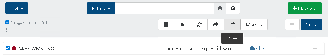 Po zakończeniu transferu w panelu XO pojawi się gotowa, ale wyłączona maszyna wirtualna. Sklonuj ją i uruchom klon jako kopię testową.